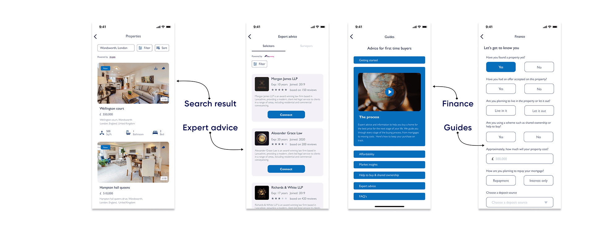 Our objective is to design and develop an application that will solve all the problems a user faces when | looking for a new home. Combining these four sections including properties search, guides, expert advice, and financing was a challenge.