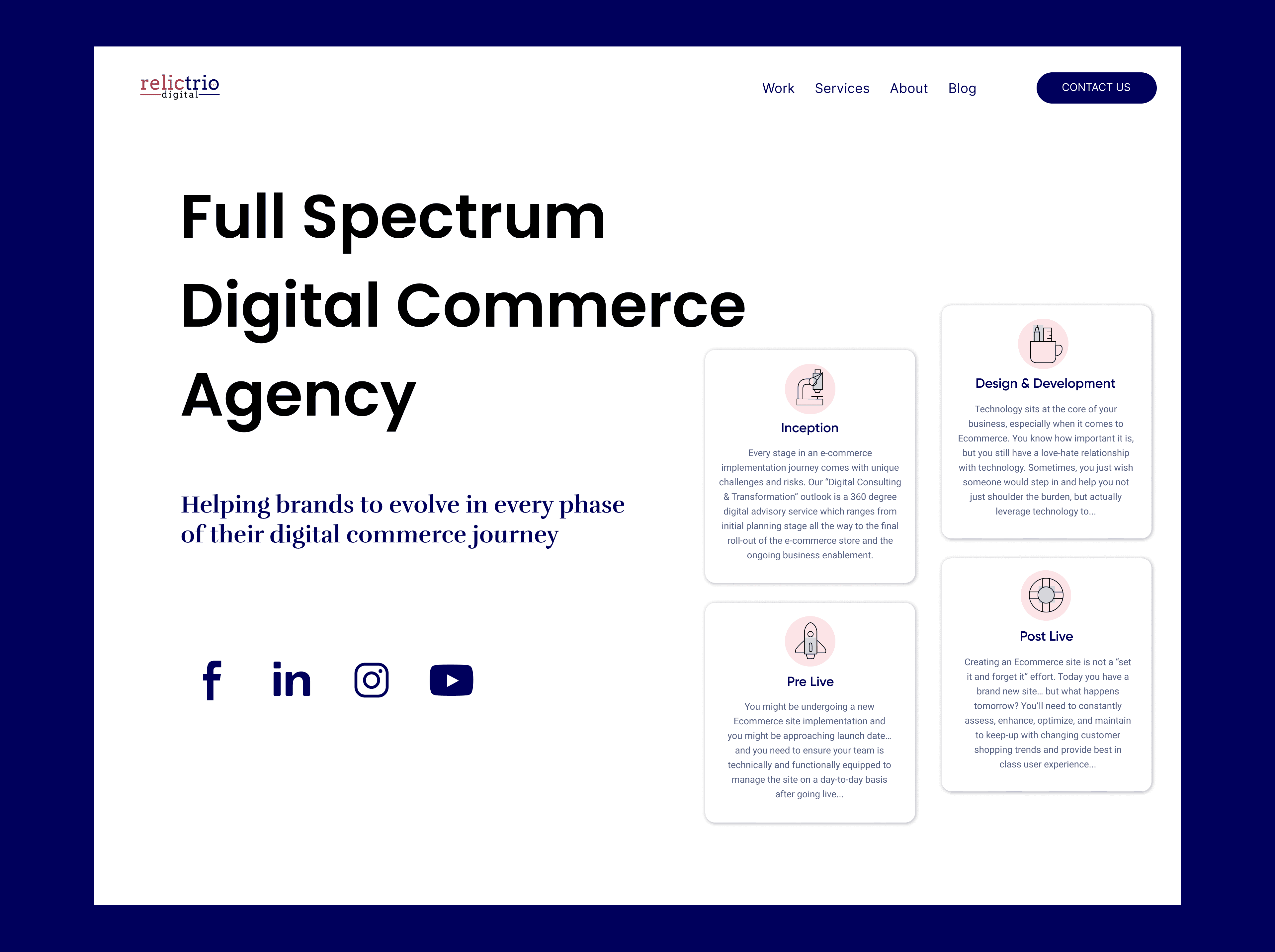 Relictrio digital is a global digital commerce agency with a core focus on creative, content and commerce. We provide a holistic suite of digital services covering overall digital empowerment, from assessing digital maturity to bespoke user experience design and innovative ecommerce solutions.